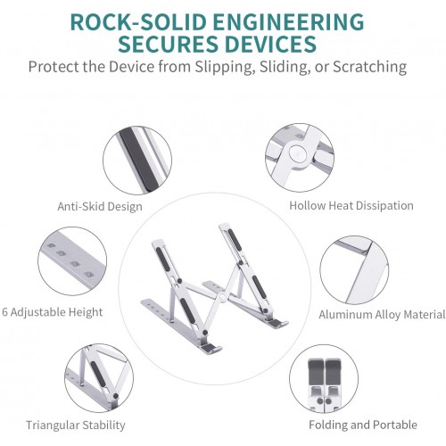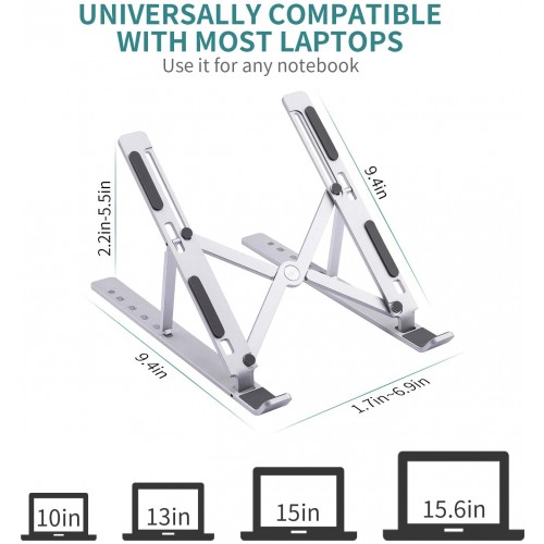 Adjustable & Foldable 10″ to 17.5″ 6 Angles Travel Laptop Stand comes with lightweight, only weighs 0.61lbs. This lptop stand is easily folded and packed in a sleeve bag, which is convenient to take anywhere, such as home, office or business trip. This laptop stand has 6 adjustable angles and heights, raising the laptop to a natural viewing height. Let you find a comfortable angel to watch and type while using the computer. It’s a good helper for you to reduce back, neck and eye fatigue. This Travel laptop stand can holds up to 17.64lbs weight by solid triangle structure and aluminum alloy. It’s a quite stable stand that doesn’t shake while typing. Moreover, there are several anti-slip silicone pads at the contact point between the stand and laptop, preventing your laptop from slipping and scratching. It is made of high quality aluminum alloy which is easy to absorb and dissipate heat. Besides, the hollow design and forward-tilt angel provide a lot of space and nature airflow for the laptop, keeping your laptop from overheating. This new Adjustable & Foldable Laptop Stand is suitable for all 10-15.6 inches laptop on the market, including MacBook, MacBook Pro, MacBook Air, HP, Lenovo, Dell, Microsoft Surface, Acer and so on. Moreover, it’s also multifunctional. Can be used as bookshelves, photo album racks or kindle stand. This laptop stand has no warranty.