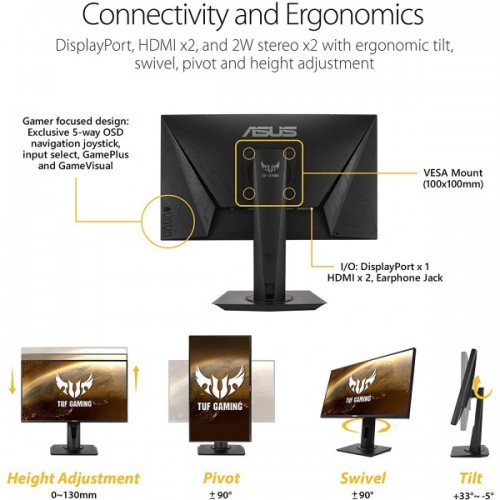 TUF Gaming VG259Q is a 24.5-inch, Full HD (1920×1080), IPS display with a fast 144Hz refresh rate designed for professional gamers and fast-paced gameplay. It also features 1ms MPRT response time and Adaptive-Sync technology, for extremely fluid gameplay without tearing and stuttering. The 24.5-inch Full HD (1920 X 1080) IPS panel of TUF Gaming VG259Q delivers stunning visuals from all angles with wide 178-degree viewing angles to ensure minimal distortion and color shift even when you’re viewing from extreme positions. TUF Gaming VG259Q has an ultra-fast 144Hz refresh rate, ensuring that even fast-paced games played at the highest visual settings look buttery-smooth and completely lag-free. Get the upper hand in first-person-shooters, racing, real-time strategy, and sports titles. Features the latest ASUS-exclusive Extreme Low Motion Blur technology, which achieves 1ms MPRT to eliminate smearing and motion blur, and makes objects in motion look sharper, so gameplay is more fluid and responsive. ASUS Shadow Boost technology clarifies dark areas of the game without overexposing brighter areas, improving overall viewing while also making it easier to spot enemies hidden in dark areas of the map. The ASUS-exclusive, integrated GamePlus hotkey offers in-game enhancements that help you get more out of your game. This function is co-developed with input from pro gamers, allowing them to practice and improve their gaming skills. ASUS GameVisual Technology has seven pre-set display modes to optimize visuals for different types of content. This unique feature can be easily accessed through a hotkey or the on-screen display settings menu. Flicker-Free technology reduces flicker to minimize eyestrain for improved comfort when you’re embroiled in long gaming sessions. ASUS Ultra-Low Blue Light technology reduces the amount of potentially harmful blue light emitted by the display. Four different filter settings are available to control the amount of blue light reduction. Extensive connectivity options, including, DisplayPort1.2×1, HDMI (v1.4)x2, and Earphone Jack support a wide array of multimedia devices. With an ergonomically-designed stand, TUF Gaming VG259Q provides tilt, swivel, pivot, and height adjustments so you can easily find your ideal viewing position. The display is also VESA-compatible for wall mounting.