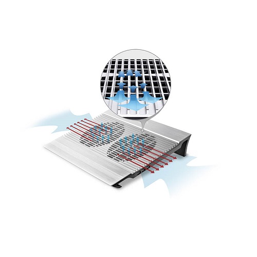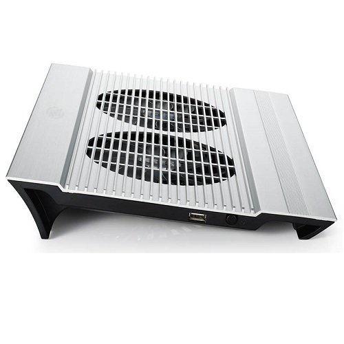 The DeepCool N8 Laptop Cooler has an extruded aluminum panel construction for efficient heat dissipation. It contains dual 140 mm fans that produce high volume airflow to achieve great cooling performance. This cooler features a fantastic air intake design that provides ideal airflow for laptop cooling, as well as 4x USB connections. The N8 laptop cooler is 380x278x55mm in total. It is a hydro-bearing type. This cooler has a 5VDC input and an operating voltage of 4.5~5VDC. The DeepCool N8 Laptop Cooler has a rated current of 0.3±10%A. It has a power input of 1.5W and a fan speed of 1000±10%RPM. The maximum airflow is 94.7CFM, and the noise level is 25.1dB(A). The DeepCool N8 Laptop Cooler comes with a 01-year warranty.