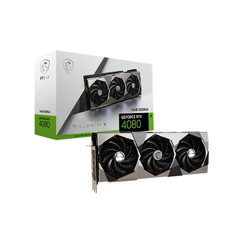 The MSI GeForce RTX 4080 16GB SUPRIM Graphics Card brings an enormous leap in performance, efficiency, and AI-powered graphics. It lets you experience ultra-high-performance gaming, incredibly detailed virtual worlds with ray tracing, unprecedented productivity, and new ways to create. It’s powered by the NVIDIA Ada Lovelace architecture and comes with 16 GB of G6X memory to deliver the ultimate experience for gamers and creators. The MSI GeForce RTX 4080 16GB SUPRIM features TRI FROZR 3S Thermal Design. Fan blades linked by ring arcs and a fan cowl work together to stabilize and maintain high-pressure airflow. The heat from the GPU and memory modules is captured by a copper baseplate and then rapidly transferred to Core Pipes. The heat from the GPU and memory modules is immediately captured by a solid nickel-plated copper baseplate and then rapidly transferred to an array of heat pipes. This widening of the thermal transfer systems with highly efficient mechanisms improves overall efficiency. Fins with a V-shaped cutout are located at the airflow passthrough to improve flow efficiency. MSI GeForce RTX 4080 16GB SUPRIM Graphics Card comes with Dual BIOS that gives you the choice to prioritize full performance in GAMING mode or low noise in SILENT mode. It comes with a bundled support bracket that can be attached to your PC case for additional graphics card reinforcement. The MSI GeForce RTX 4080 16GB SUPRIM comes with 3 years warranty.