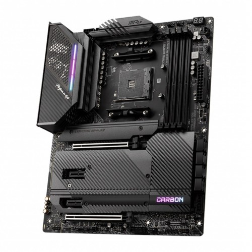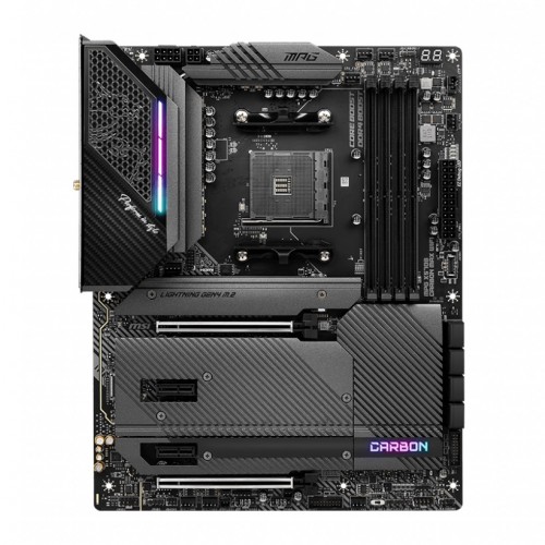 The MSI MPG X570S CARBON MAX WIFI Motherboard Supports AMD Ryzen 5000 Series, 5000 G-Series, 4000 G-Series, 3000 Series, 3000 G-Series, 2000 Series, and 2000 G-Series desktop processors for Socket AM4. It comes with 4x DDR4 memory slots and supports up to 128GB. It offers lightning Fast Game experience with PCIe 4.0, Lightning Gen 4 x4 M.2, USB 3.2 Gen 2. It comes with an Enhanced Power Design. It is equipped with 12+2 Duet Rail Power System, 8-pin plus 4-pin CPU power connectors, Core Boost, and DDR4 Boost. The MSI MPG X570S CARBON MAX WIFI has a Premium Thermal Solution. Aluminum cover, MOSFET thermal pads rated for 7W/mK, additional choke thermal pads, and 3x M.2 Shield Frozr is built for a high-performance system and non-stop gaming experience. The motherboard supports 16.8 million colors / 29 effects controlled in one click. MYSTIC LIGHT EXTENSION supports both RGB and RAINBOW LED strip. It features a 2.5G LAN with LAN Manager and Intel Wi-Fi 6E Solution with an upgraded network solution for professional and multimedia use. Delivers a secure, stable, and fast network connection. It features a 6-layer PCB made of 2oz thickened copper and server grade-level material. The MSI MPG X570S CARBON MAX WIFI comes with 3 years of warranty.